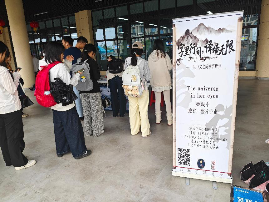 为深入贯彻落实习近平总书记关于“中华美学讲求托物言志、寓理于情,讲求言简意赅、凝练节制,讲求形神兼备、意境深远,强调知、情、意、行相统一”的重要指示精神,坚守中华文化立场,传承中华文化基因,展现中华审美风范,广东金融学院清远校区燎原文学社于2025年12月2日,在清远校区北区食堂门口成功举办“字里行间,译境无限——以中文之美领悟世界”的翻译实践活动,吸引众多学生踊跃参与。