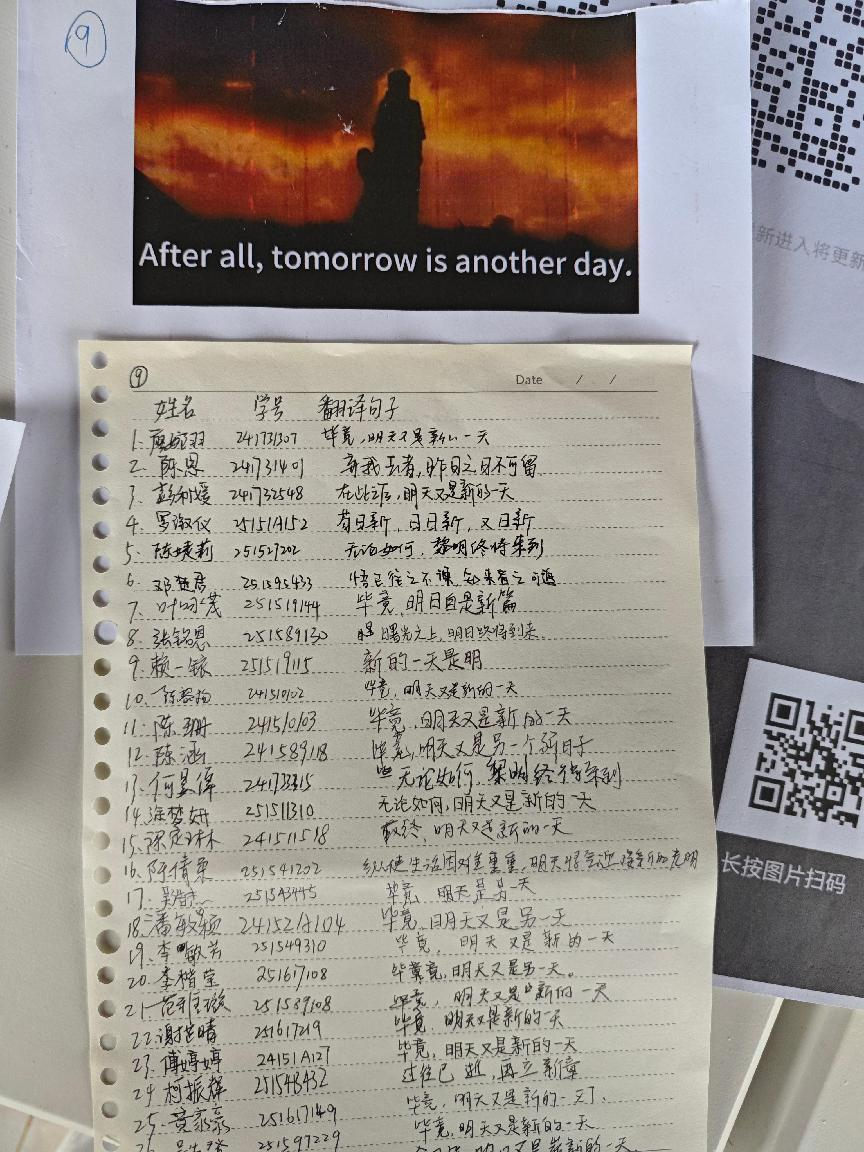 本次活动以经典影视、文学作品中的精选台词为翻译素材,引导同学们通过现场翻译与语言润色,深入体会中文表达的凝练之美与文化意蕴。活动现场设有翻译展台,同学们积极参与,在字句推敲中感受翻译的艺术魅力,提升语言敏感度与跨文化理解能力。活动期间,同学们踊跃提交翻译作品,展现出对语言艺术的热爱与创造力。优秀作品通过线上线下展示,进一步激发了同学们对中华语言文化的兴趣与认同。