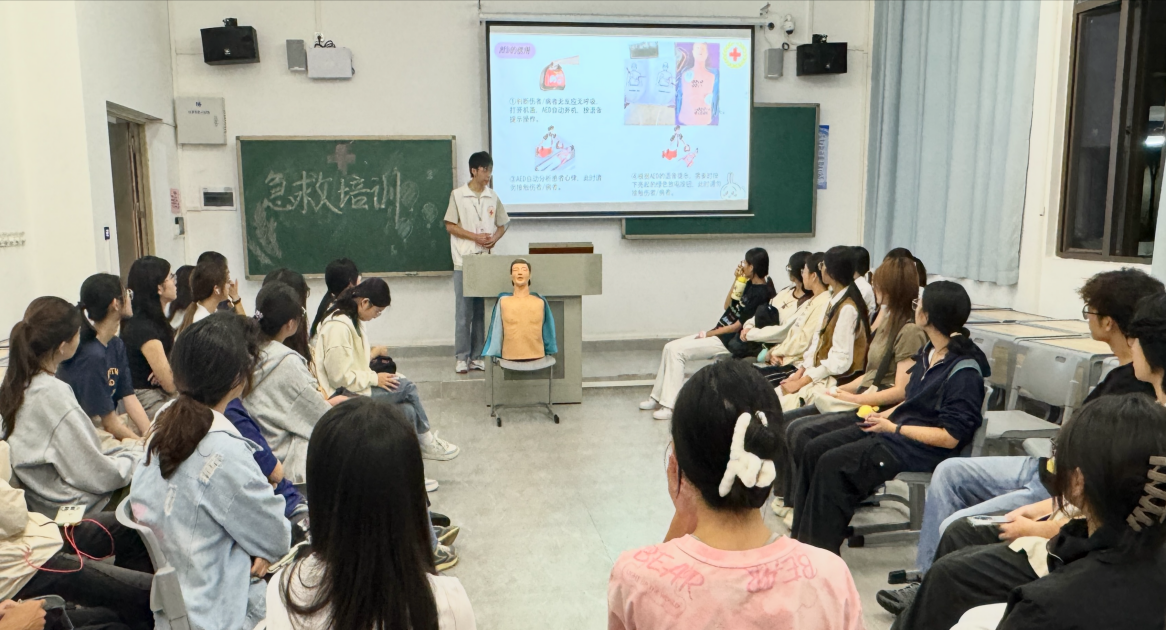 校红会成员对AED的使用进行了科普,同时结合校园内可能发生的实际场景进行具体分析,将AED操作与此前学习的CPR技能串联讲解,帮助学员们深化对两种急救手段的理解,切实意识到“急救需求就在身边”。